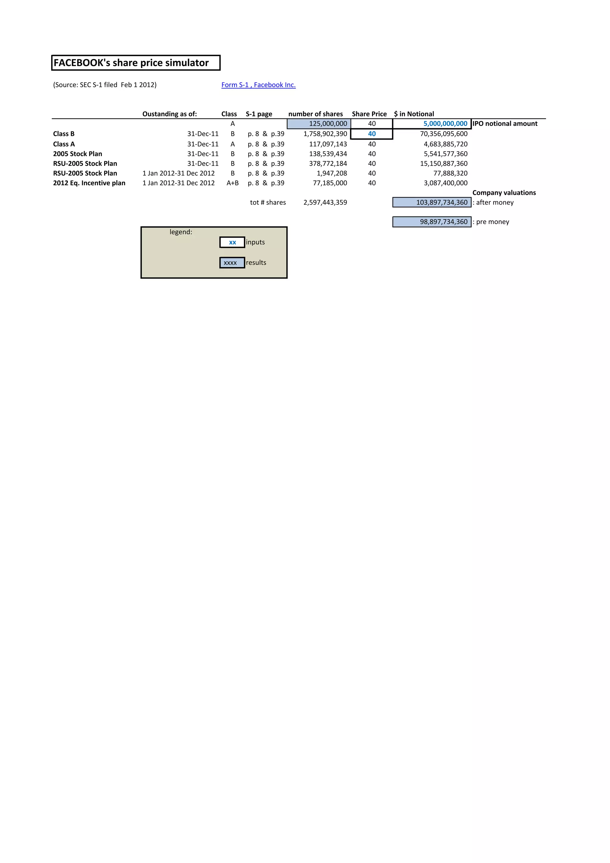 Facebook's S-1 filing from February 2012 outlines the company's outstanding share classes and estimated company valuation based on a hypothetical $40 per share price. It estimates the total number of outstanding shares to be over 2.5 billion, which would value the company at over $103 billion on a post-money basis or $98 billion on a pre-money basis. The summary provides key details on Facebook's share structure and how they estimated company valuation based on a sample share price.