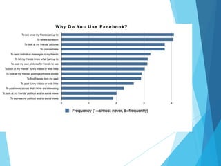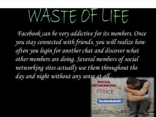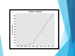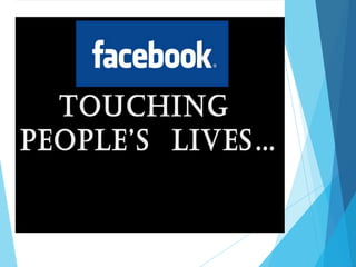 This presentation discusses the key components and features of Facebook, including personal profiles, timelines, photos, videos, groups and pages. It outlines the advantages such as sharing information, chatting, and keeping users entertained. Potential disadvantages are also mentioned. The document concludes by examining Facebook's impact on media, society, politics, and its role in emotionally reuniting lost family members and friends.