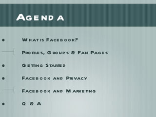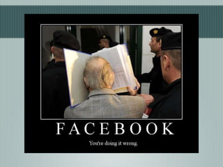 The document provides an overview of using Facebook for marketing purposes. It discusses key aspects of Facebook including profiles, pages, groups and privacy settings. It then outlines strategies for businesses to use Facebook including creating a page, posting regularly to engage fans, using events and ads to promote the page, and integrating Facebook with other online and offline channels. The presentation encourages businesses to be active on Facebook but also maintain a positive presence in line with Facebook's terms and guidelines.