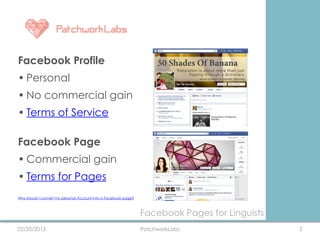 The document discusses the advantages of converting personal Facebook accounts to business pages for linguists, highlighting features such as insights, promotions, and improved professionalism. It emphasizes the importance of defining target groups and developing a strategy for user engagement and content creation. Additionally, it provides technical guidelines for page metrics and optimal posting times to maximize reach and interaction.