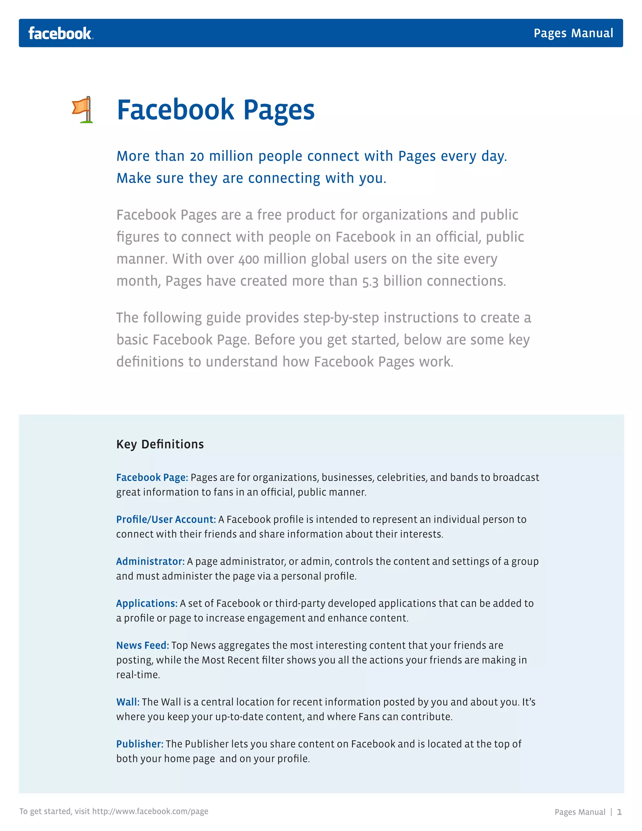 The document provides instructions for creating and managing a Facebook Page. It defines key terms like Page, Profile, Administrator, and Applications. It then guides the user through setting up a basic Page, including adding a photo, information, and posts. It also explains how to understand insights on people connecting to the Page and customize settings, applications, and admins. The overall purpose is to help new users understand the basics of setting up and optimizing their Facebook Page.