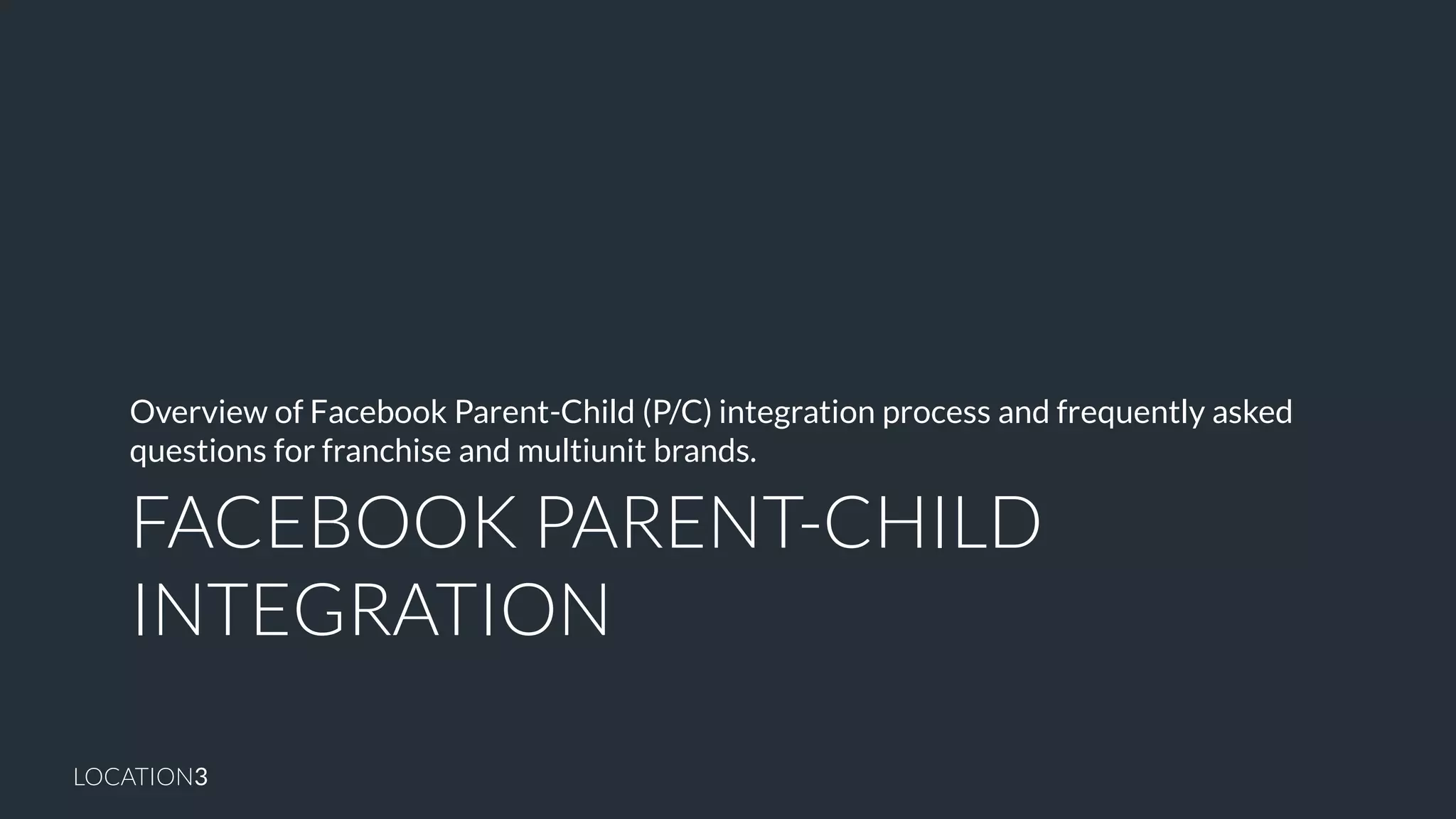 The document provides an overview of the Facebook parent-child integration process for franchise and multi-unit brands, highlighting methods to enhance brand visibility and maintain data integrity. It discusses the creation and management of local pages, local prioritization, and answers frequently asked questions about admin access and page management. The parent-child structure aims to improve user experience while allowing local ownership of individual pages.