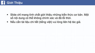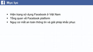 Tài liệu trình bày hiện trạng sử dụng Facebook tại Việt Nam, cho thấy sự tăng trưởng nhanh chóng về số lượng người dùng và mối lo ngại về an toàn thông tin cá nhân. Nó cũng giải thích về nền tảng Facebook, cách thức xác thực và cấp quyền thông qua OAuth 2.0, cùng với các biện pháp bảo vệ để giảm thiểu rủi ro thông tin bị lộ. Những ứng dụng không rõ nguồn gốc và việc cấp quyền bừa bãi được nhấn mạnh như là nguyên nhân chính dẫn đến nguy cơ mất an toàn thông tin.