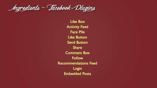 This document discusses various social plugins that can be used on websites to provide personalized and social experiences for users. It describes plugins like the Like, Send, Share, Comment, and Follow buttons which allow users to interact with and share content from the website on Facebook. It also covers widgets like the Like Box, Activity Feed, and Facepile which display Facebook activity and profiles on the website. The document explains the purpose and benefits of each plugin type.
