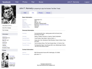 1) The document profiles John F. Kennedy and includes wall posts from his Facebook page discussing various events from his presidency.