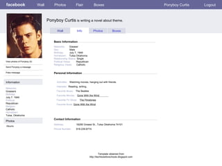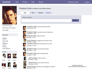 facebook Ponyboy Curtis is writing a novel about theme. Personal Information Wall Photos Flair Boxes Ponyboy Curtis Logout View photos of Ponyboy (5) Send Ponyboy a message Poke message Wall Info Photos Boxes Basic Information Information Networks : Greasers Birthday: July 7, 1949 Political: Republican Religion: Catholic Hometown: Tulsa, Oklahoma Photos Networks: Greaser Sex: Male Birthday: July 7, 1949 Hometown: Tulsa Oklahoma Relationship Status: Single Political Views: Republican Religious Views: Catholic Activities: Watching movies, hanging out with friends. Interests: Reading, writing, Favorite Music: The Beatles Favorite Movies: Gone With the Wind Favorite TV Show: The Flinstones Favorite Book: Gone With the Wind Albums Contact Information Address: 18295 Grease St., Tulsa Oklahoma 74101 Phone Number: 918-239-8774 Template obtained from http://techtoolsforschools.blogspot.com