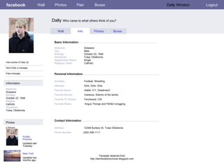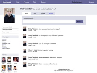 The document appears to be a mock Facebook profile for a character named Dally Winston from the book The Outsiders. It includes basic personal information like his birthday, hometown, religion, and networks. It also lists posts on his wall from himself and other characters with short quotes and comments about various topics like rumbling, movies, and wishing he was back in New York. The profile includes photos of Dally and albums from a rumble and a trip to New York.