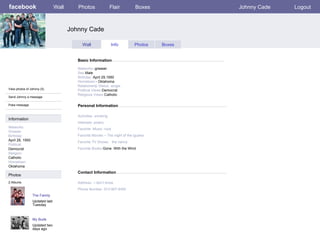 The document appears to be profiles from a fictional social media site for characters from the novel The Outsiders. It includes profiles for greaser characters Johnny Cade, Sodapop Curtis, Darry Curtis, Cherry Valance, and soc Bob, providing basic biographical information and exchanges between the characters on their walls.