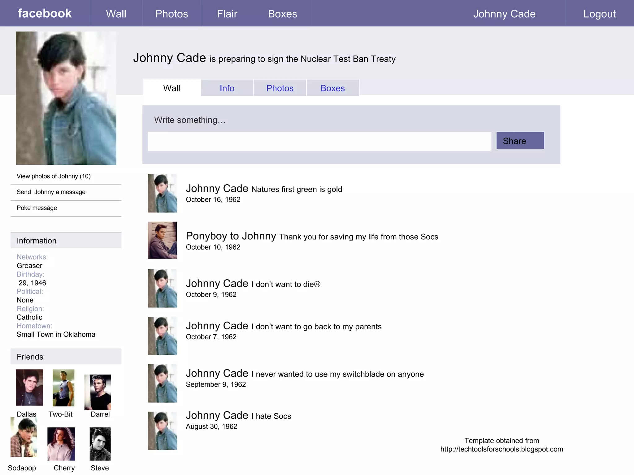 The document contains profile information about Johnny Cade, a greaser from a small town in Oklahoma. It lists his birthday, hometown, relationship status, political and religious views. It also contains posts on his wall from 1962 discussing getting jumped by Socs, not wanting to die or go back to his parents, and hating Socs. It provides his address and phone number as well as albums containing photos of him, sunsets, and his friends.