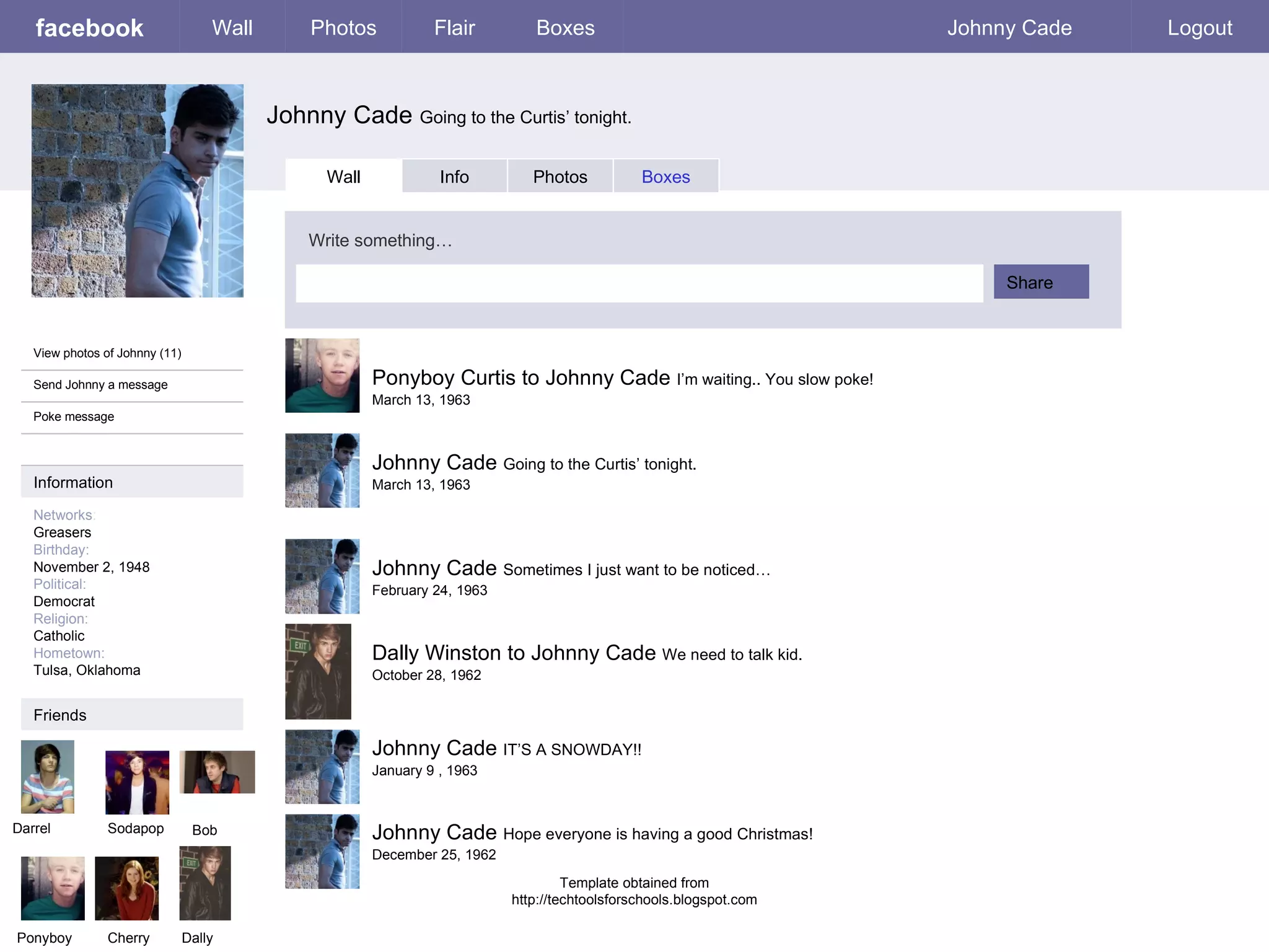 Johnny Cade is a greaser from Tulsa, Oklahoma who is friends with Darrel, Sodapop, Bob, and Ponyboy Curtis. He is Catholic and a Democrat. On March 13, 1963 he said he was going to the Curtis' house that night and sometimes just wants to be noticed. On January 9, 1963 he said it was a snow day.
