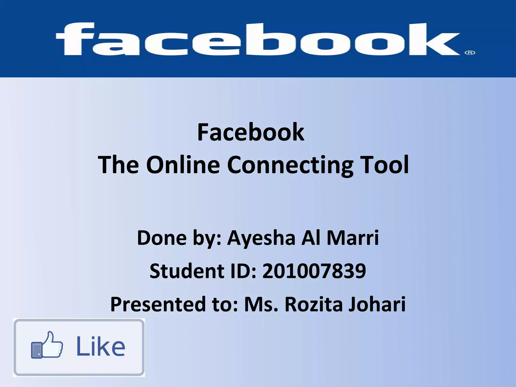 Facebook is a social networking site launched in 2004. It was founded by Mark Zuckerberg and others at Harvard. Facebook allows users to connect with friends, share photos and updates. While it helps users stay connected, it can also be addictive and raise privacy concerns. The document provides an overview of Facebook's history and features, who uses it, benefits and drawbacks, and how to create an account and find friends.