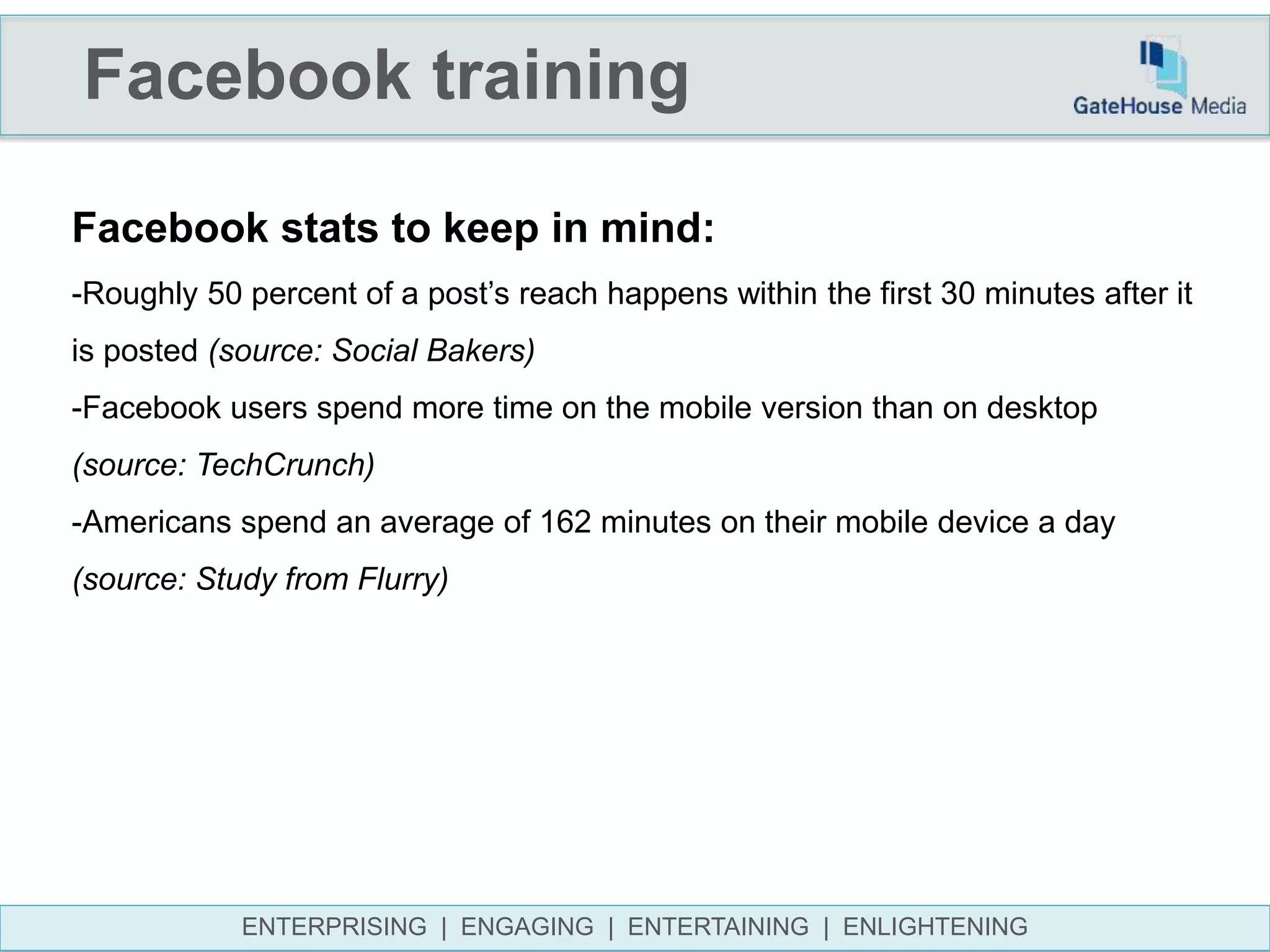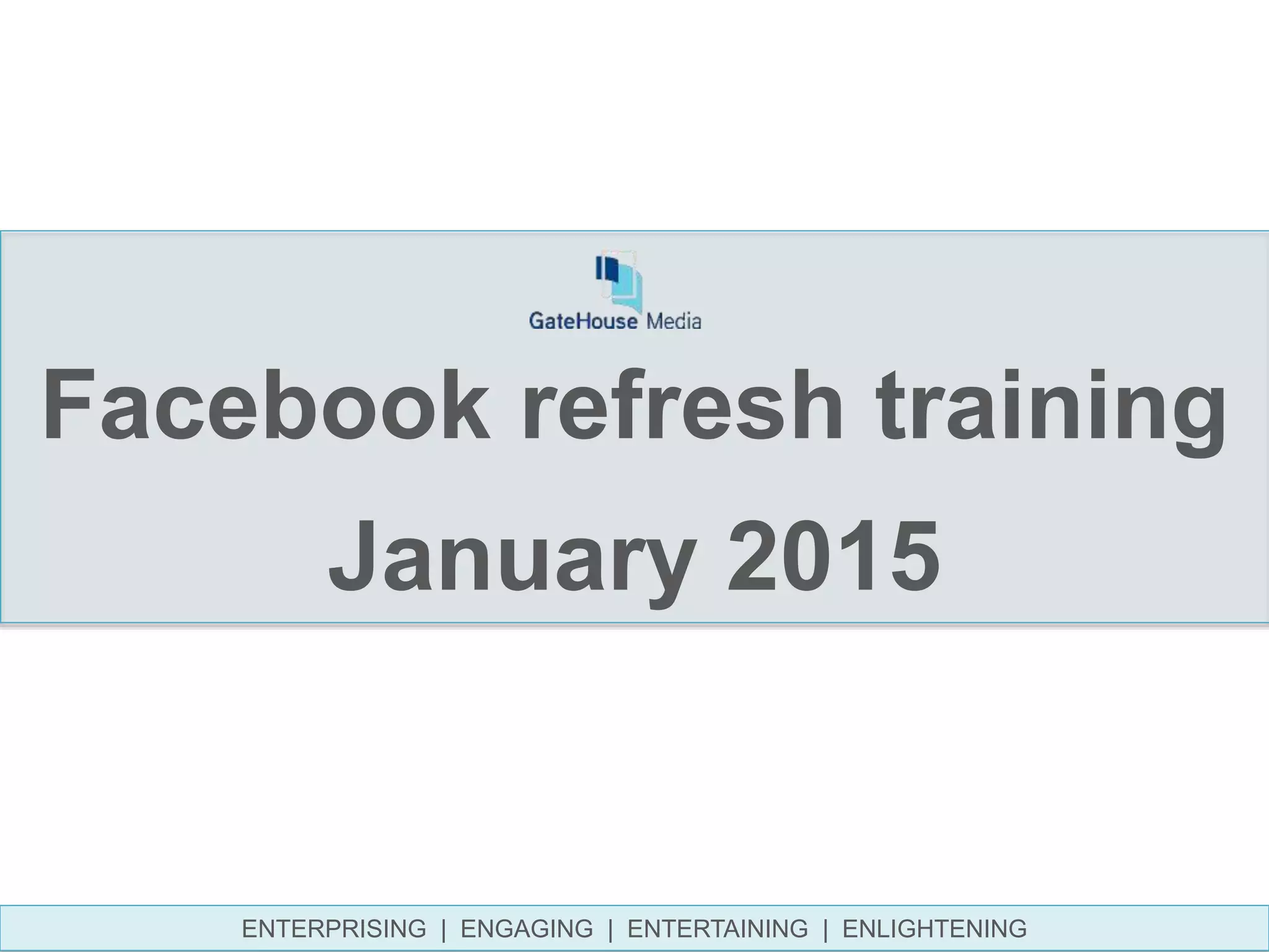 The document provides an overview of Facebook training for January 2015. It includes statistics on Facebook usage such as 50% of post reach within 30 minutes and more time spent on mobile. It also lists Facebook as responsible for 24.6% of social media referrals in Q4 2014. New admin tools are described that allow targeting audiences by gender, age, location or interests for individual posts. The training also reviews existing tools like saving drafts, liking/commenting, and using insights to analyze post and audience data.