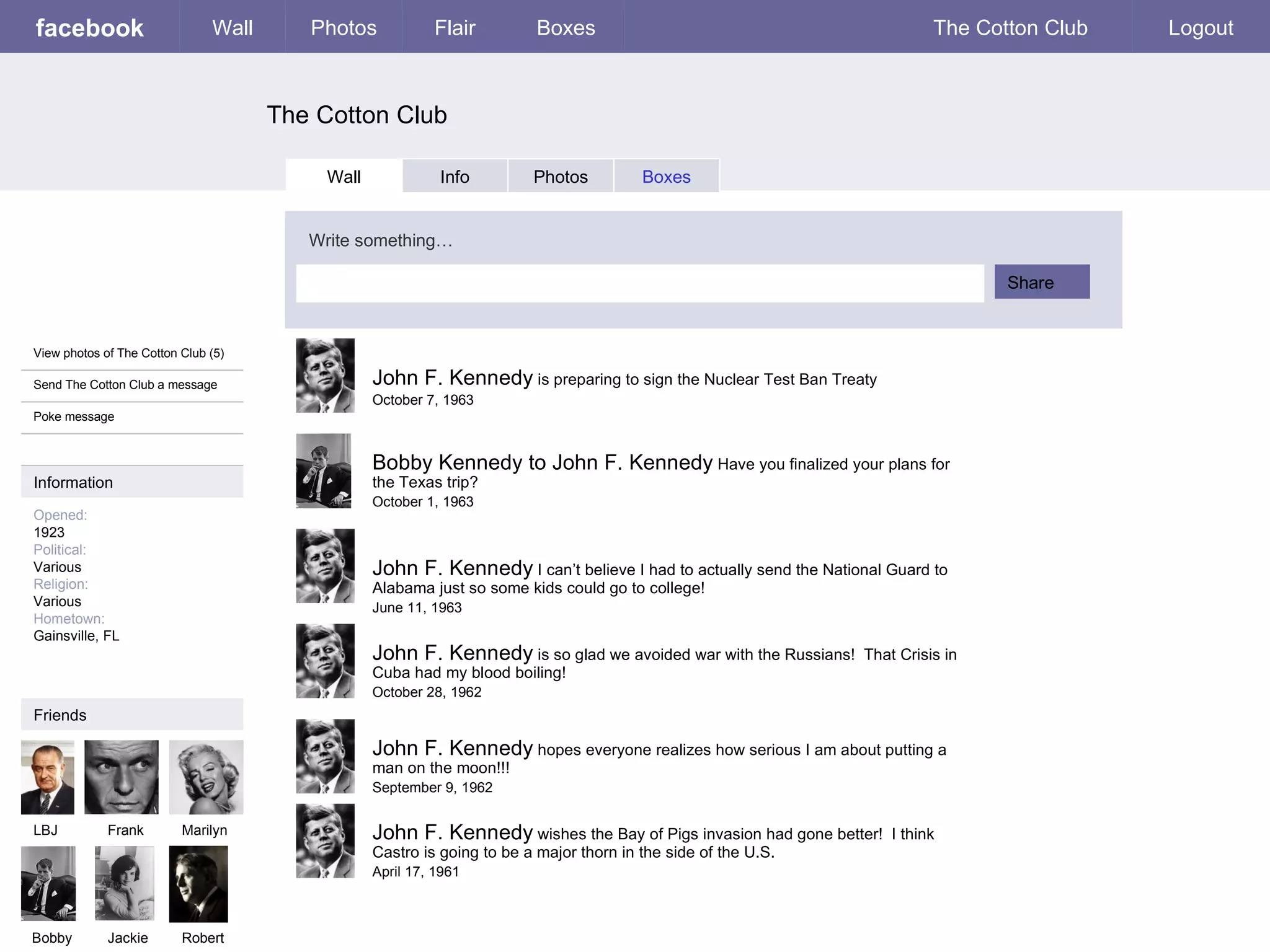 The document appears to be a mock Facebook profile page for John F. Kennedy containing biographical information and wall posts from 1962-1963 related to major events during his presidency including the Cuban Missile Crisis, the Nuclear Test Ban Treaty, and sending the National Guard to Alabama to enforce desegregation of schools.