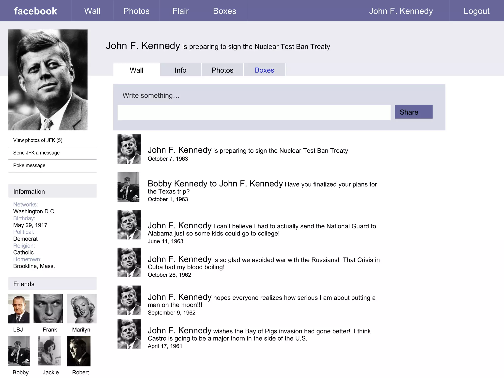 John F. Kennedy is preparing to sign the Nuclear Test Ban Treaty. The document includes posts from JFK discussing various events from his presidency including the Bay of Pigs invasion, the Cuban Missile Crisis, promoting civil rights, and putting a man on the moon. It also includes basic biographical information about JFK such as his birthday, hometown, and religious and political views.