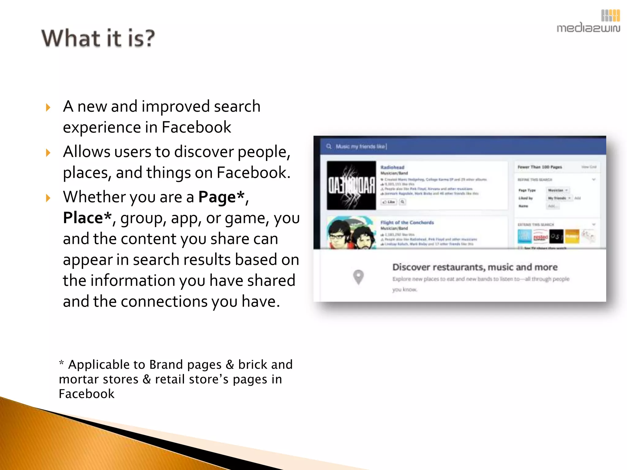 The document discusses Facebook's new Graph Search feature, which enhances the search experience by allowing users to discover people, places, and content based on their social connections. It emphasizes the importance of keeping business pages updated and highlights how search results are influenced by user relationships and privacy settings. Graph Search is currently in beta and will be available to a broader audience in the future, while emphasizing that only Facebook-shared content can be searched.