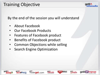 This document provides information about Facebook products and services as well as search engine optimization (SEO). It discusses Facebook features like profiles, photos, messaging and keeping in touch with people. It outlines the benefits of Facebook for businesses such as generating leads, branding, customer engagement, and driving traffic. It also discusses creating Facebook pages, connecting with people, engaging audiences, and influencing others. For SEO, it covers meta tags, Google webmaster and analytics tools, image optimization, and white hat techniques. Target timelines for SEO results are also provided.