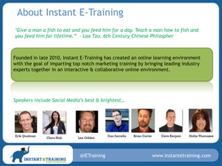 Instant E-Training provides online marketing training through live workshops and an online video library, featuring experts in social media, SEO, Facebook, and more. They teach strategies for Facebook advertising, including how to target fans through demographics and interests, optimize ads based on metrics like CTR and CPC, and develop fan acquisition campaigns. The training is recognized by SEMPO and aims to teach lifelong marketing skills through leading industry experts.