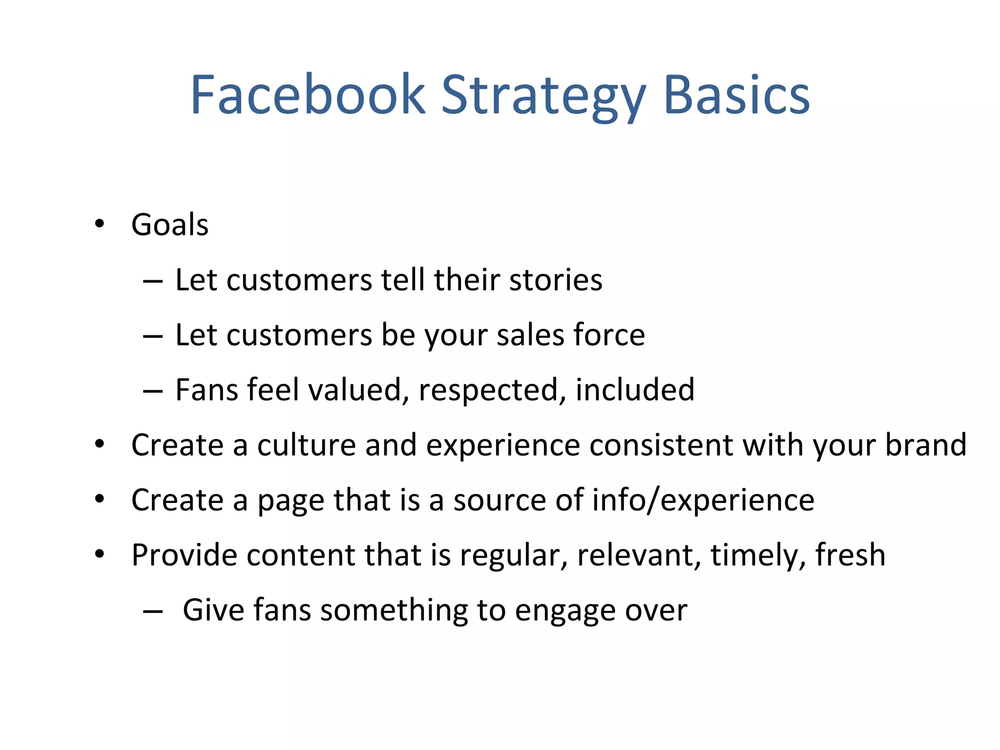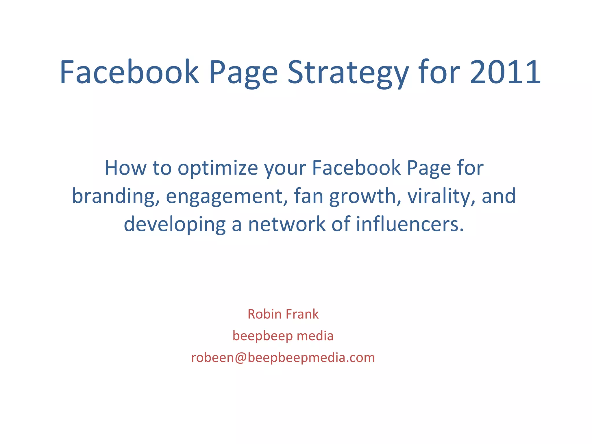 The document outlines strategies to optimize a Facebook page for branding, engagement, and fan growth. It emphasizes creating engaging content, using humor, and posting at optimal times while monitoring interactions to refine strategies. Additionally, it discusses leveraging user-generated content, design strategies, and analytics tools to enhance performance and foster community engagement.