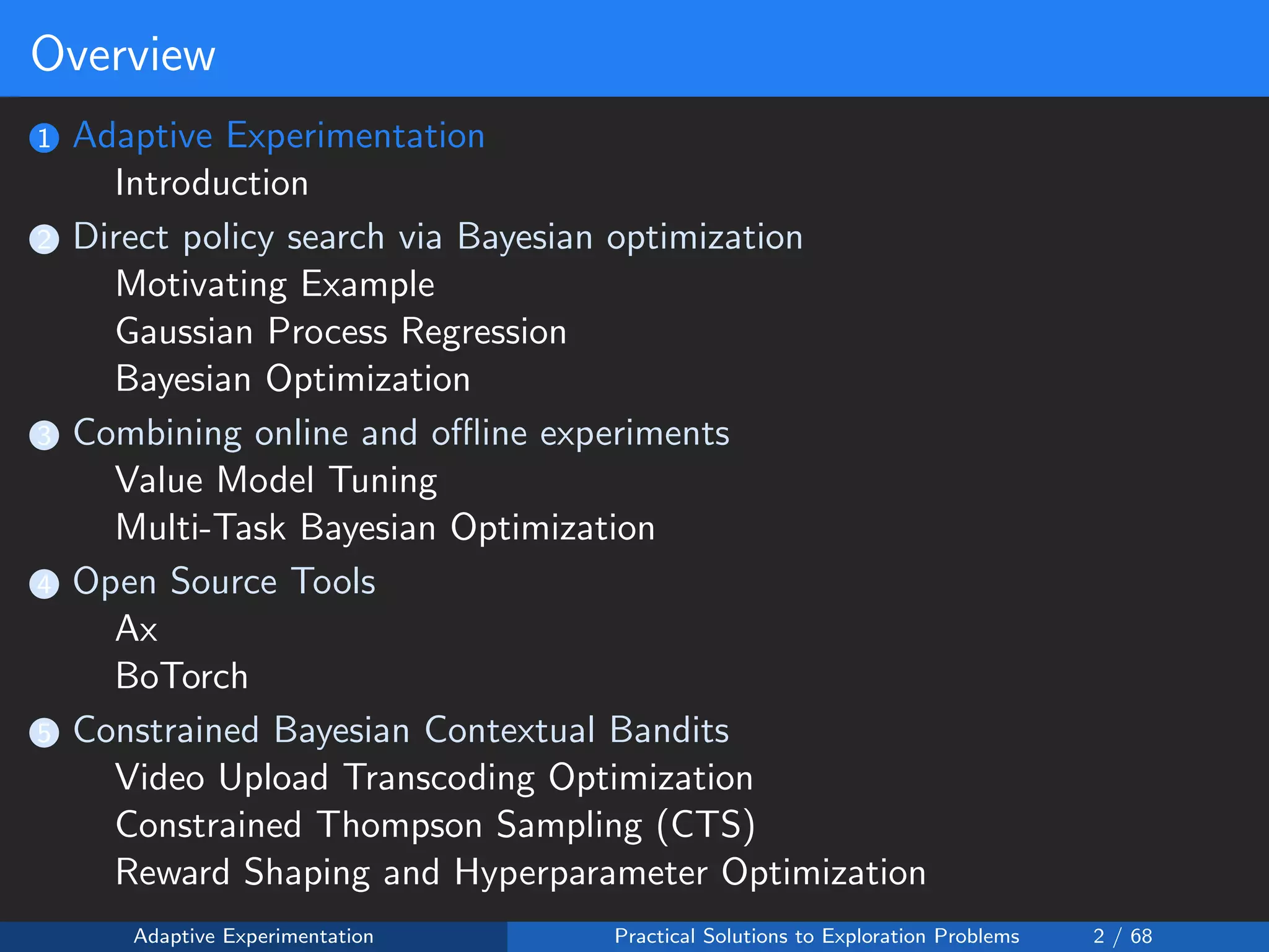 The document discusses adaptive experimentation at Facebook, focusing on practical solutions for exploration problems in decision-making through methods such as Bayesian optimization and contextual bandits. It outlines the methodology for implementing automated experimentation to balance performance and constraints, with applications including video upload transcoding optimization. Various tools and techniques, such as Ax and BoTorch, are introduced to improve and automate the experimentation process.