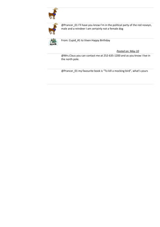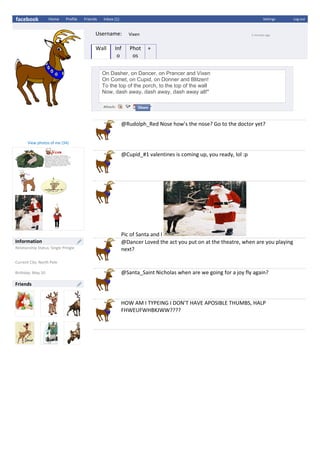 Vixen posts on her wall reciting the classic Christmas poem "The Twelve Days of Christmas" and tags several friends. She comments on Rudolph's nose and asks Cupid if he is ready for Valentine's Day. Vixen also posts a photo with Santa and asks Dancer about an upcoming performance. In response to a friend, Vixen clarifies that she is a male reindeer, not a female dog.