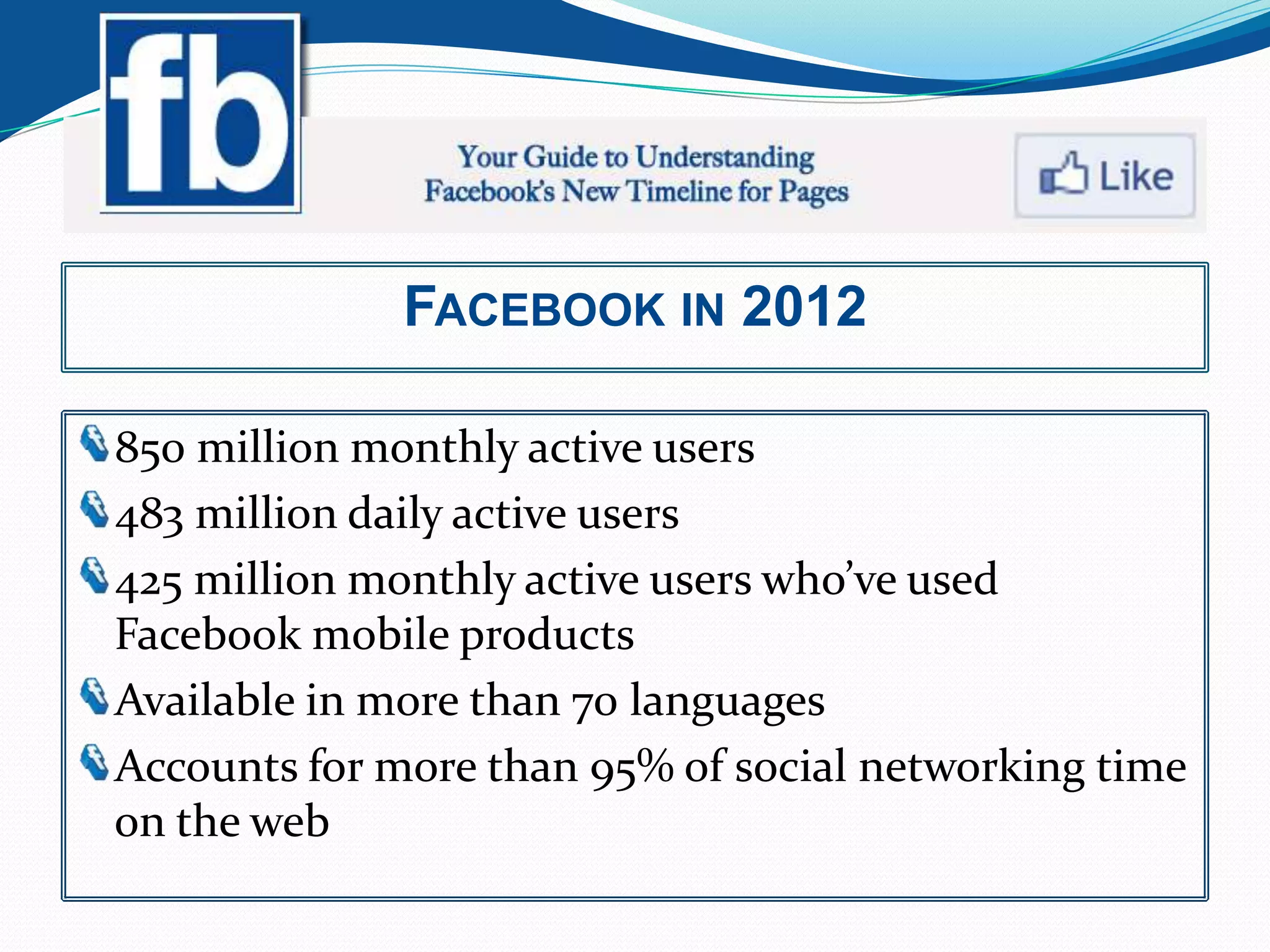 The document provides information about changes to Facebook pages in 2012 with the introduction of Timelines. Key points include: