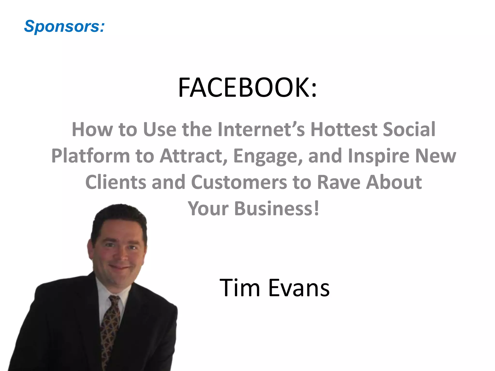 The document provides a comprehensive guide on how to effectively use Facebook as a marketing tool for businesses, highlighting its significance in customer engagement and brand promotion. It covers strategies for creating impactful business pages, leveraging customer interactions, and utilizing video and shareable content to enhance visibility and engagement. The document emphasizes the importance of analytics and return on investment (ROI) to measure the effectiveness of Facebook marketing efforts.