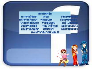 สมาชิกกลุ่ม นางสาววิจิตรา ละออ 52810202020 นางสาวสุกัญญา พลอยบุตร 52810202026 นางสาวสุกัญญา ราชชุยแสน 52810202027 นางสาวอัญชลี ทองโพธิ์ใหญ่ 52810202042 นางสาวอภิญญา ศรีประยูร 52810202039ค.บ.ภาษาอังกฤษ ห้อง 2 - 3.