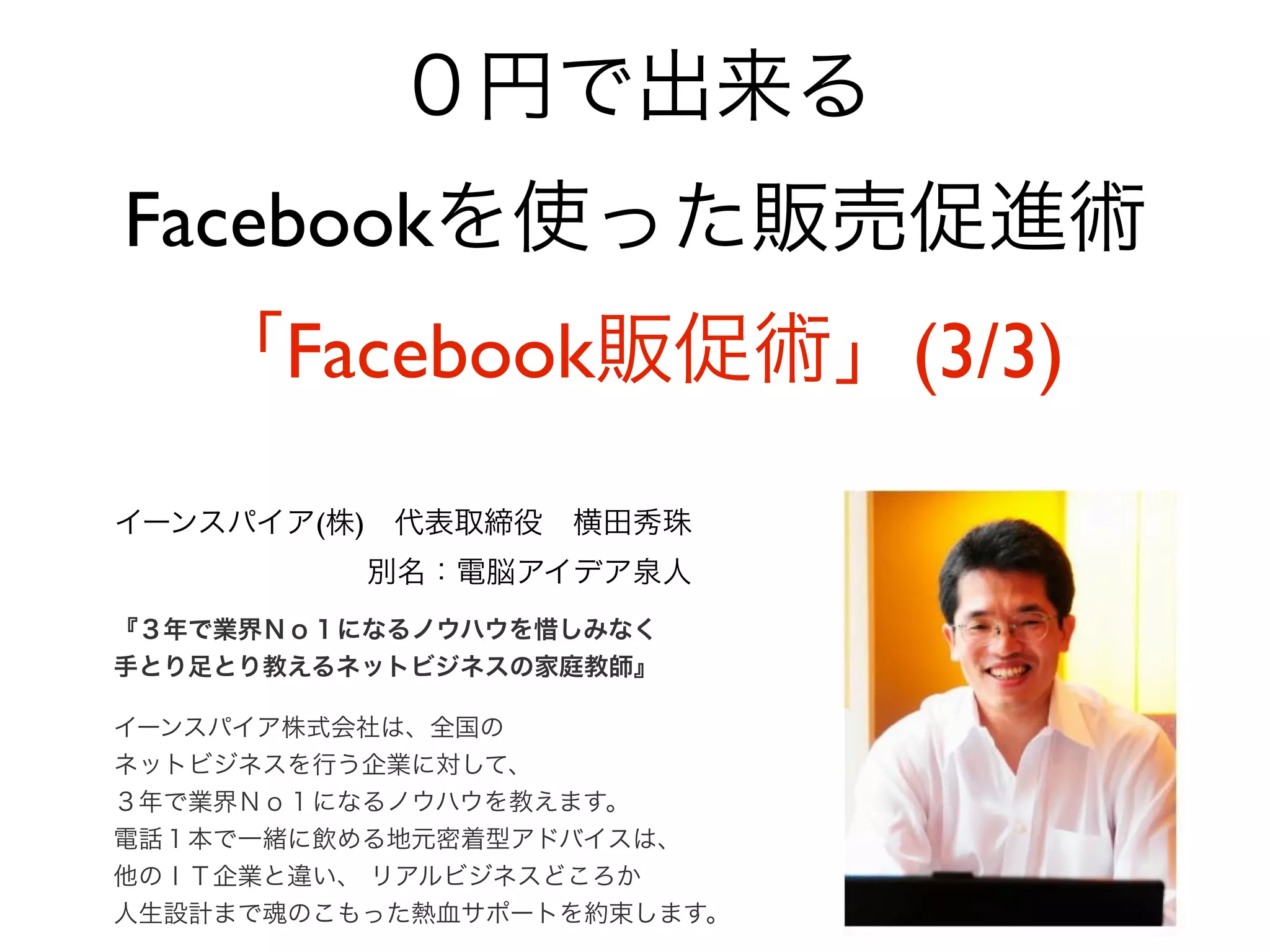 Facebookを使った販促は ネットビジネスではなく リアルビジネスである。 イーンスパイア(株) 横田秀珠の著作権を尊重しつつ、是非ノウハウはシェアして行きましょう。