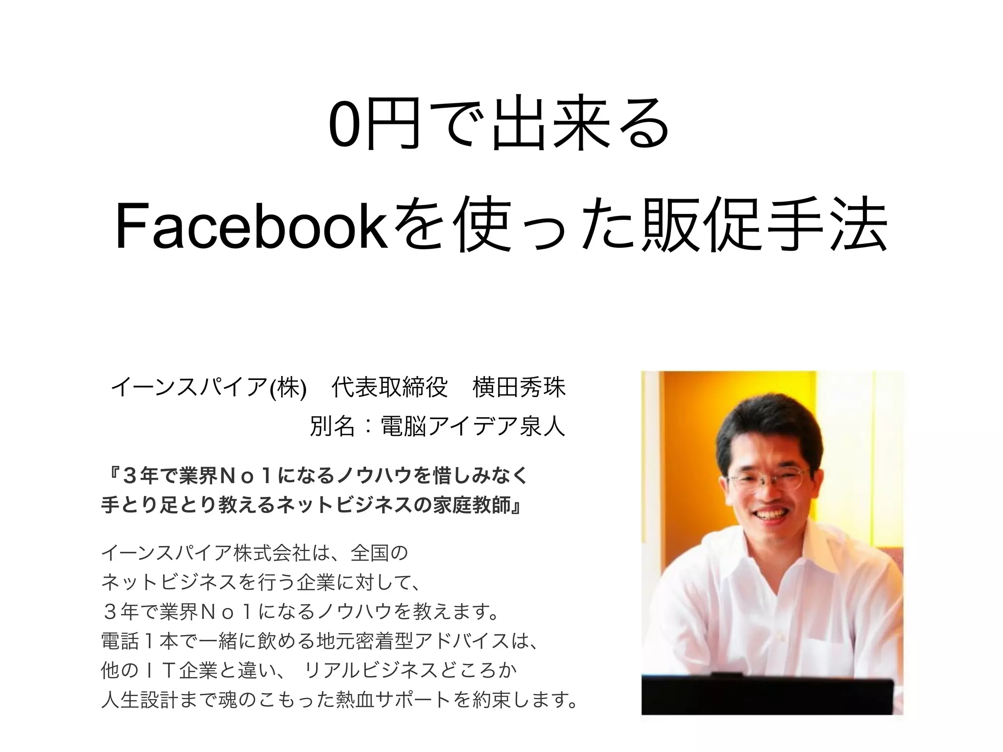 友達 Facebookページ イーンスパイア(株) 横田秀珠の著作権を尊重しつつ、是非ノウハウはシェアして行きましょう。 46