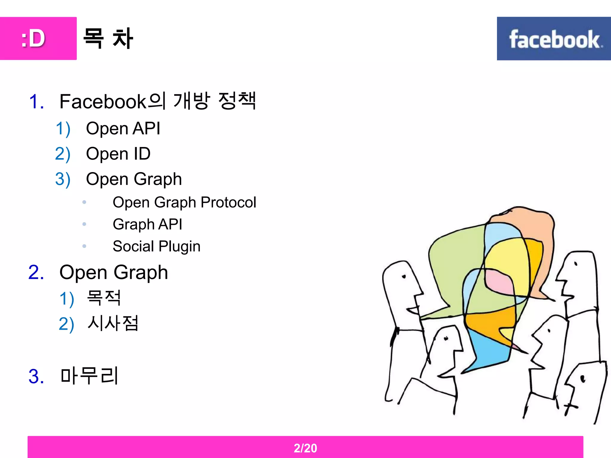Referencehttp://developers.facebook.com/http://developers.facebook.com/pluginshttp://developers.facebook.com/docs/opengraphFacebook’s future –The Open Graph, Quentin Mahe Digital Strategist버섯돌이의소셜웹인사이트- INSIDE SOCIAL WEB ‘ blogSERI 경영 노트- 소통방식의 변화를 주도하는 페이스북, 서민석, 삼성경제연구소http://www.digieco.co.krhttp://www.ibm.com/developerworks/kr/library/x-androidfacebookapi/index.htmlhttp://dalinaum-kr.tumblr.com/post/1647936332/facebook-is-considered-harmfulhttp://www.facebook.com/notes/yoonbongs-ios-simple-tip/tip-facebook-api-sayongsi-gandanhan-tib/157032024337163http://www.theireyes.com/?tag=%EA%B7%B8%EB%9D%BC%ED%94%84apihttp://www.bloter.net/archives/35275 :D19/20