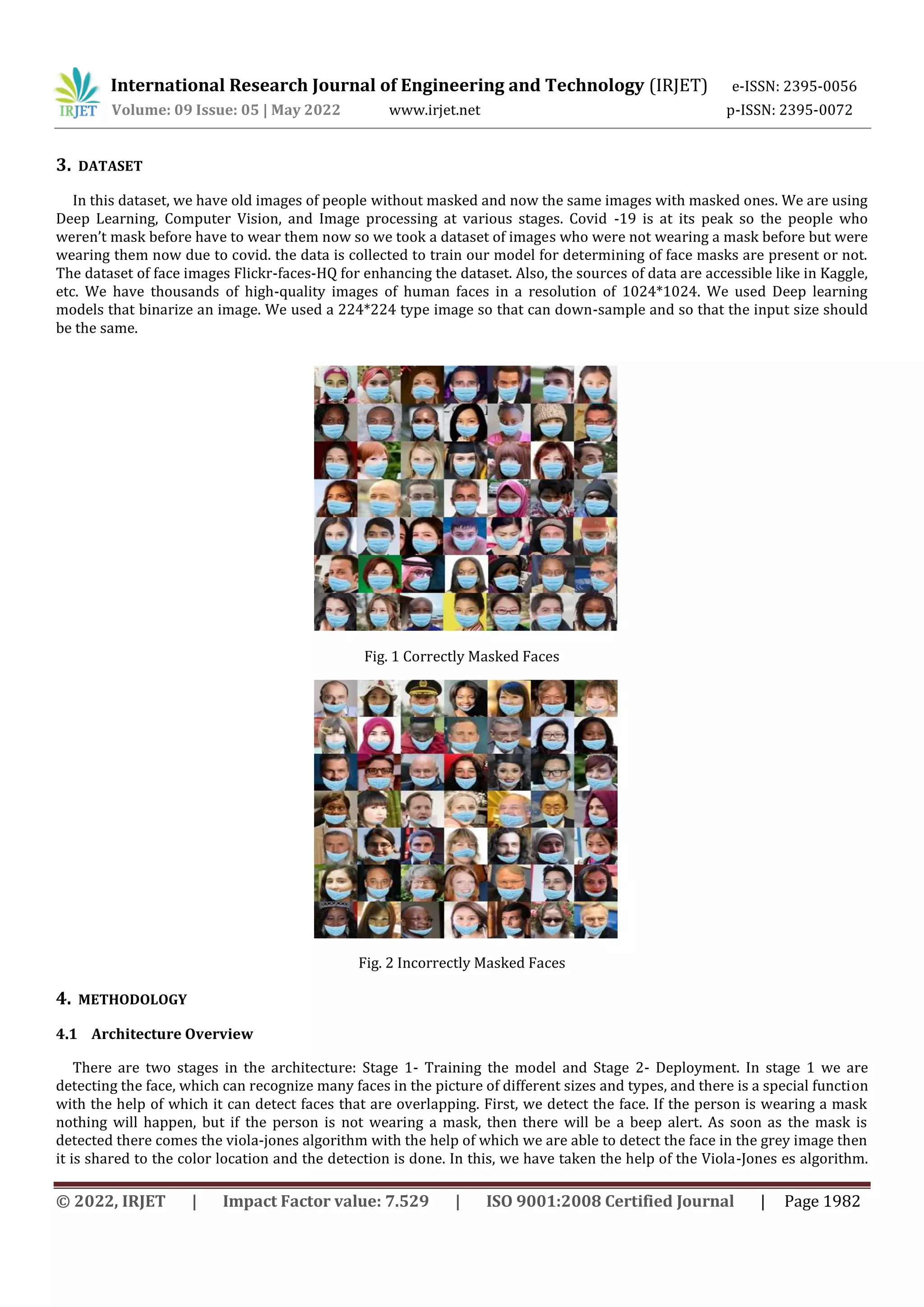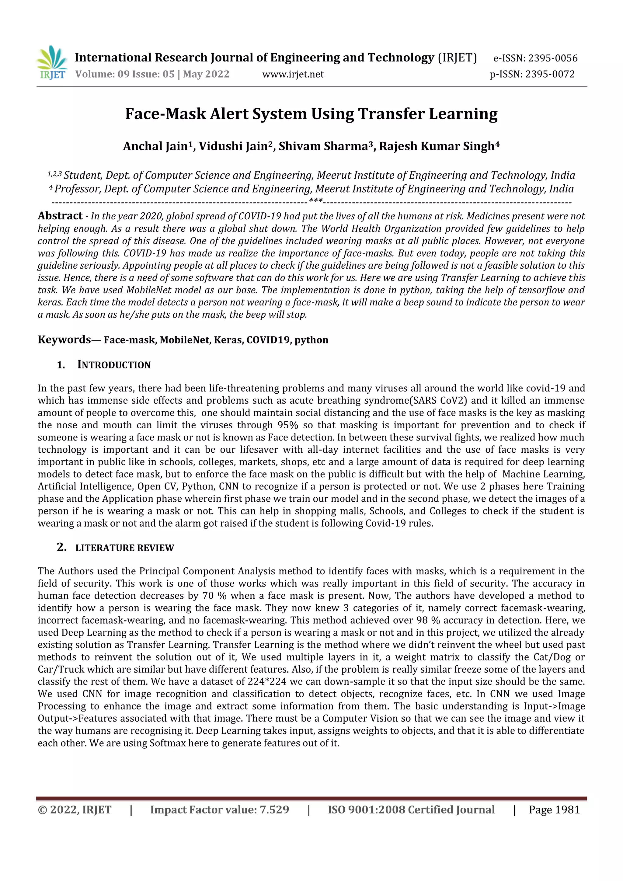 This document describes a face mask detection system using transfer learning. The system is trained using a dataset of images labeled as with or without a mask. It uses the MobileNet model as the base model for transfer learning. During deployment, the system detects faces in real-time using a camera. If a face is detected without a mask, it will make a beep sound alert. The system achieved 99% accuracy on the test dataset in detecting masked and unmasked faces. The goal is to help enforce mask guidelines and limit the spread of COVID-19.