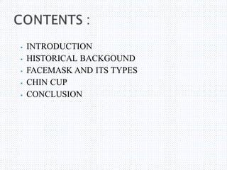 This document discusses facial masks and chin cups used in orthodontic treatment. It provides historical background on facial masks, describing their development over 100 years ago. It outlines the key components of orthopedic facial mask therapy, including the facial mask itself with forehead and chin caps connected by a metal frame, as well as intraoral appliances and elastic forces. The document discusses different types of facial masks and their indications, effects, and guidelines for use in treating Class III malocclusions and maxillary deficiencies. It also briefly covers chin cups and their effects of downward and backward rotation of the mandible.