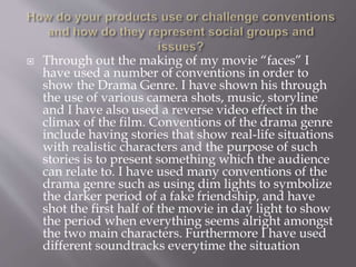 The document discusses the filmmaker's short film titled "Faces" and how it uses various conventions of the drama genre. Some key points: