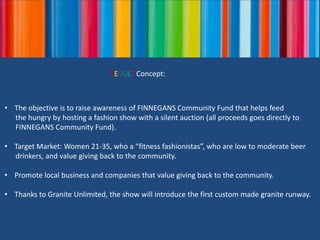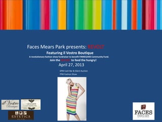 The 'Revolt Charity Fashion Show' on April 27, 2013, at Faces Mears Park aims to raise awareness and funds for Finnegans Community Fund to combat local hunger by promoting participating local businesses. The event features a silent auction, VIP tickets with perks, and local influencer Paige Vigil as the emcee to draw attention. Participants are encouraged to promote the event and local businesses, with a suggested donation for general admission to support the cause.