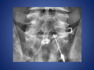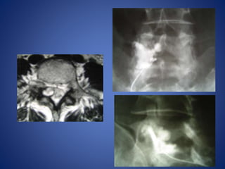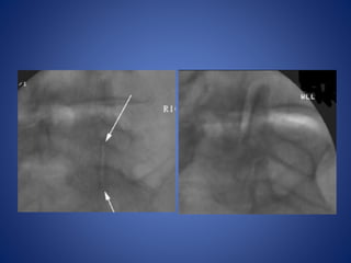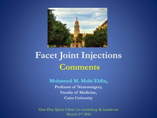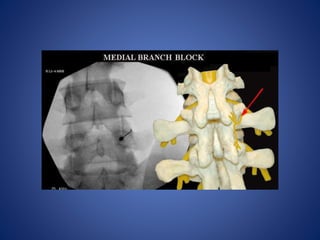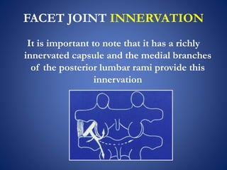 This document discusses facet joint injections for treating back pain. It describes the innervation and anatomy of normal and degenerative facet joints. Facet joint injections involve injecting local anesthetics and/or steroids into or near the facet joint under fluoroscopy or CT guidance. They can be used diagnostically to determine if facet joints are a source of pain or therapeutically to reduce inflammation and pain. The techniques for cervical, lumbar, and C1-C2 injections are covered, along with important technical aspects and potential complications. While facet joint injections are commonly used to treat facetogenic back pain, more research is still needed to evaluate their long-term effectiveness.