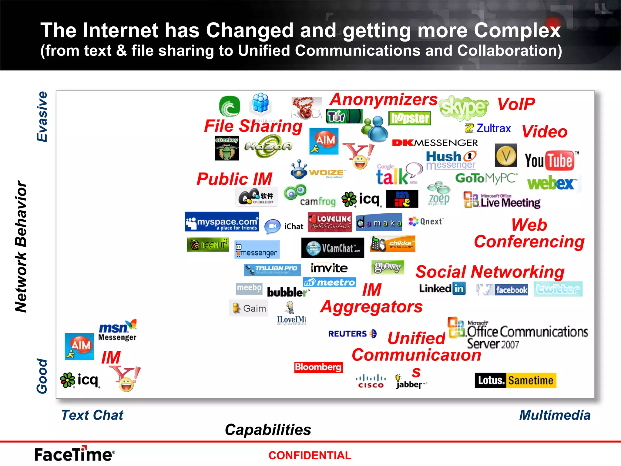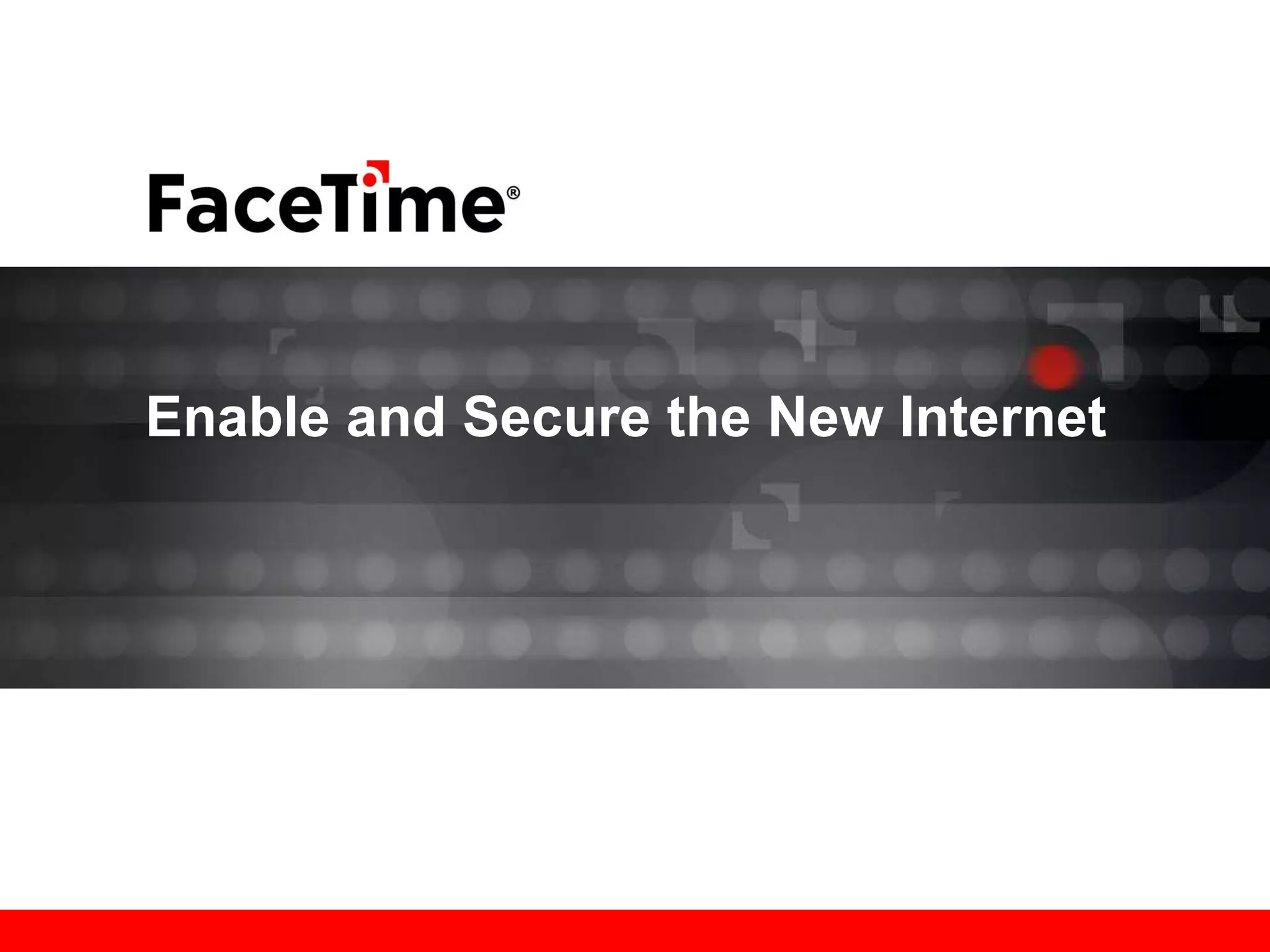 The document discusses how the internet has become more complex with the rise of unified communications, collaboration tools, and social networking. It notes that information leakage is a top concern for IT professionals. The document also outlines requirements for securely enabling new internet applications, including visibility and control of real-time apps, comprehensive malware protection, and granular policy enforcement. FaceTime's unified security gateway aims to meet these requirements through application identification, inspection, policy enforcement, and archiving capabilities.