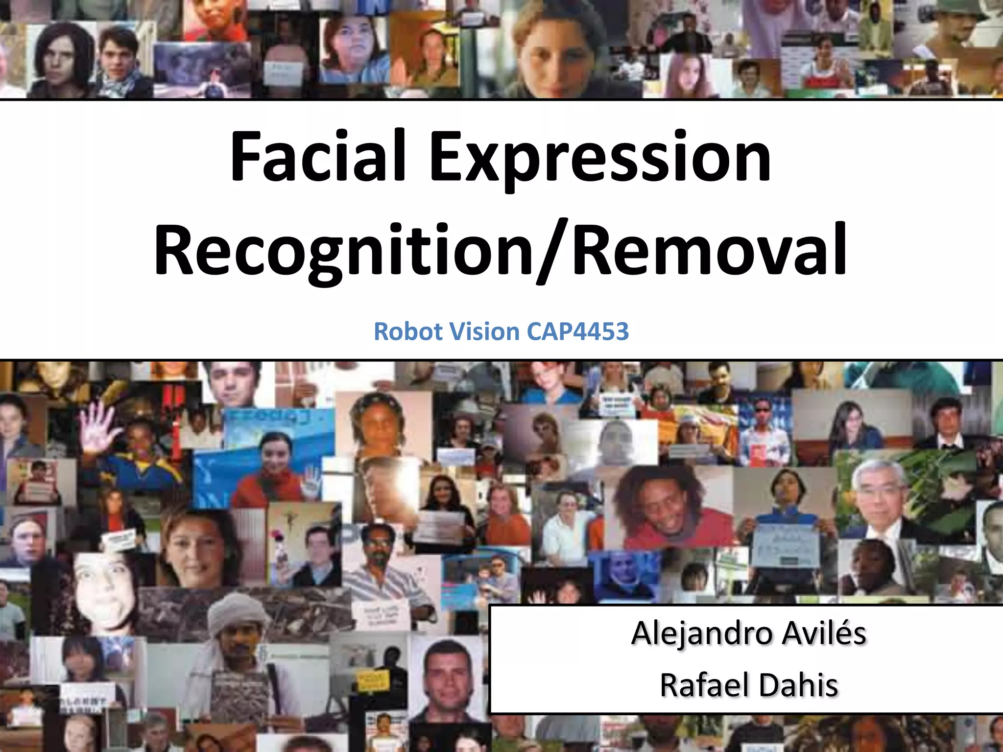 The document describes a framework for facial expression recognition and removal from 3D face models. The framework involves aligning an expressional 3D face to a generic model, building normal and expression residue spaces through training data, learning the relationship between these spaces using RBF regression to infer expressions, and reconstructing a neutral face by subtracting the inferred expression from the input face. The method is evaluated on the BU-3DFE database and shown to effectively recognize and remove expressions, reconstructing neutral faces.
