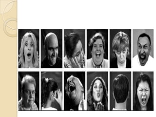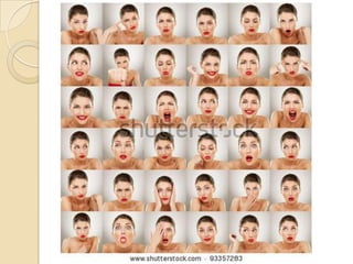 The document summarizes key aspects of facial expressions. It discusses the basic structure of facial expressions involving the eyes and full face. It then examines specific facial expressions for happiness, sadness, anger and fear by describing the characteristics of the mouth and eyes for each. The document also covers facial expressions in animation, individual differences in expressions, and tips for facial expressions when giving presentations, such as smiling with the eyes and using expressions to engage an audience.