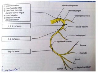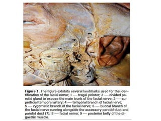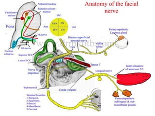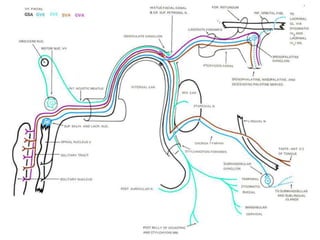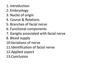 The document provides a comprehensive overview of the facial nerve, including its embryology, anatomical course, branches, functional components, and clinical considerations. The facial nerve controls muscles of facial expression, conveys taste sensations, and interacts with several head and neck ganglia. It discusses variations, testing methods, and potential surgical implications related to the facial nerve.