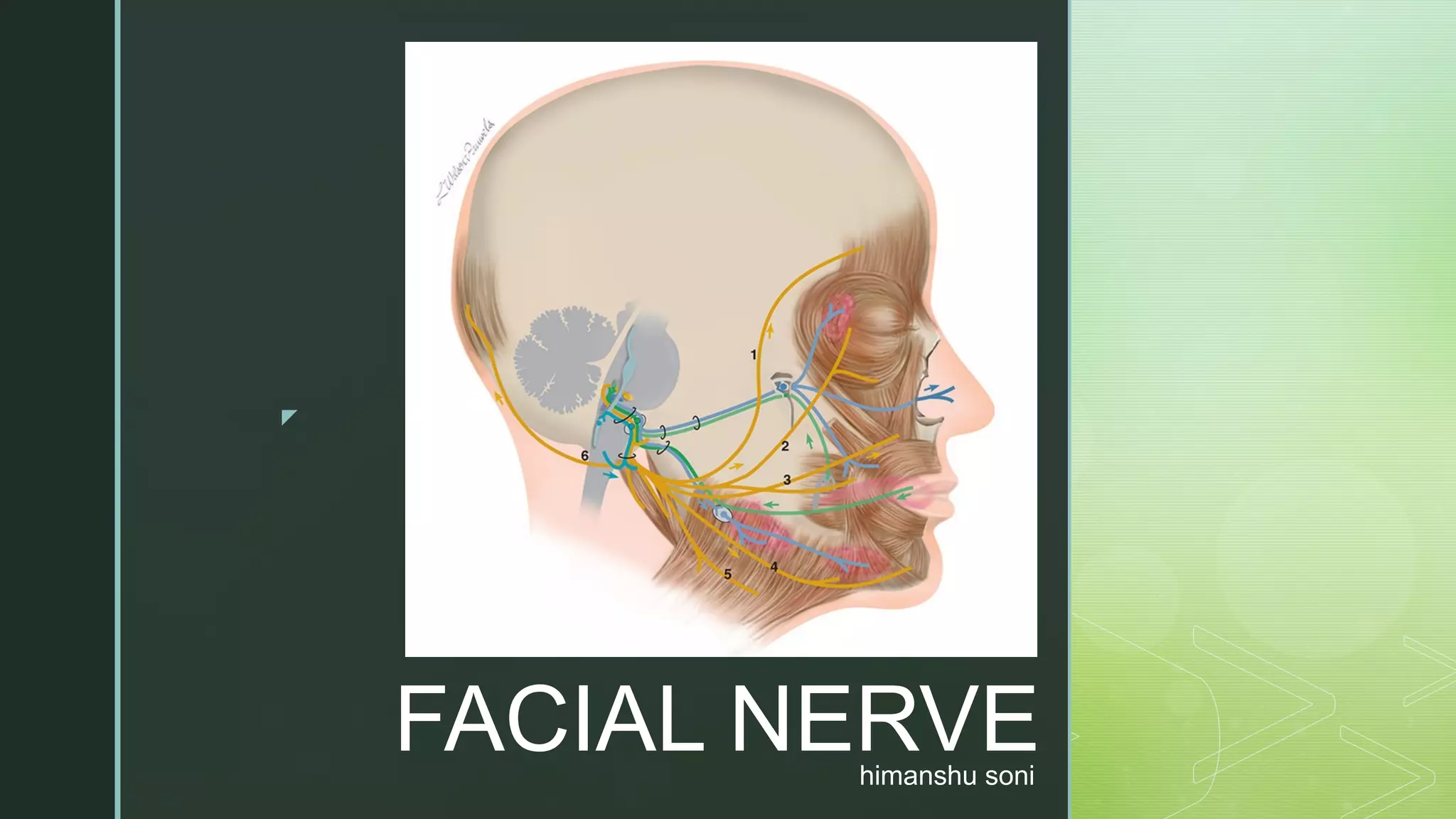 The facial nerve is a mixed nerve that is predominantly motor. It innervates the muscles of facial expression and the scalp, ear, and neck. It has motor, sensory, and parasympathetic secretomotor functions. The facial nerve exits the brainstem and travels through the internal acoustic meatus, facial canal, and stylomastoid foramen before branching in the parotid gland. It gives off several branches including the chorda tympani, nerve to stapedius, and branches to neck muscles.