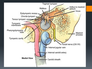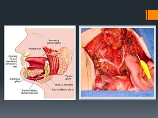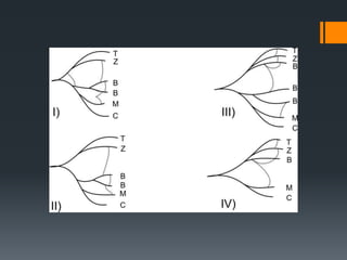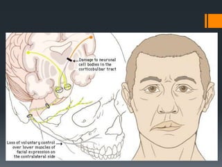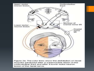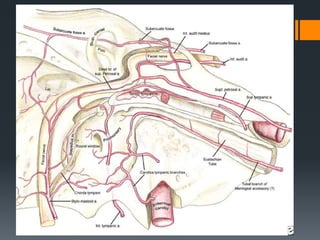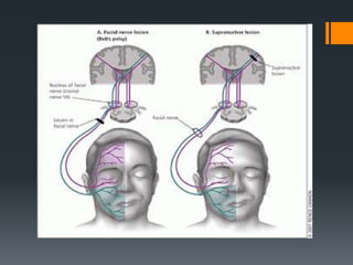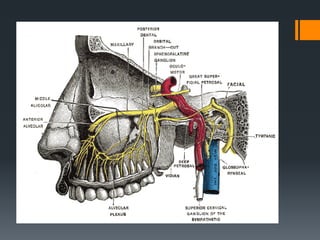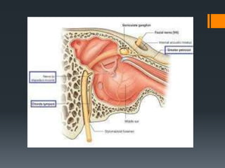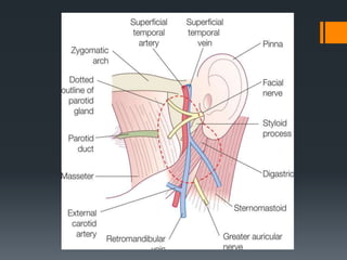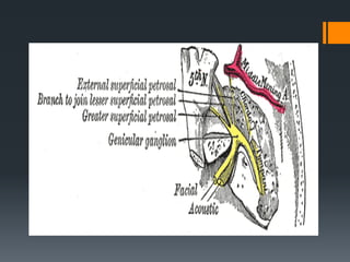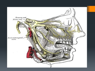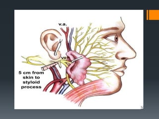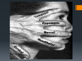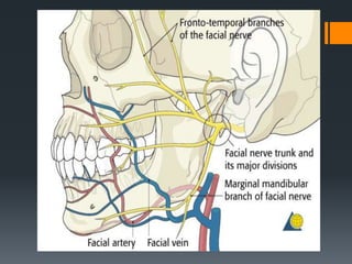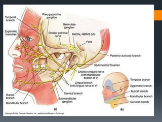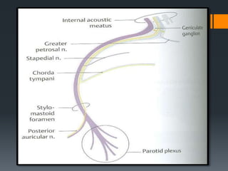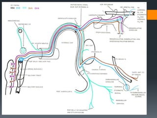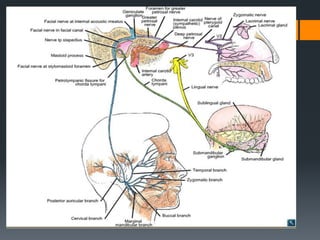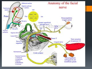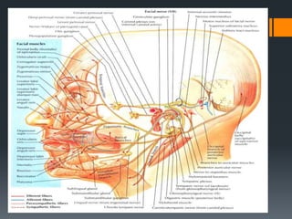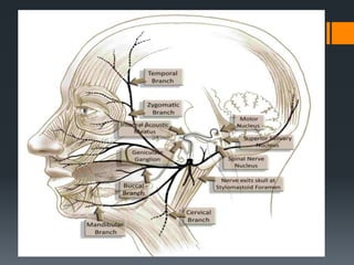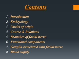 The document discusses the anatomy and embryology of the facial nerve. It begins with an introduction stating that the facial nerve is the seventh cranial nerve and is mixed with both motor and sensory components. It then covers the embryological development of the facial nerve from the second branchial arch. The document outlines the course of the facial nerve from its nuclei of origin in the brainstem through its intracranial, intratemporal, and extracranial segments. It details the branches and functional components of the facial nerve as well as associated ganglia. Variations and blood supply of the facial nerve are also mentioned.