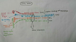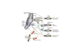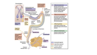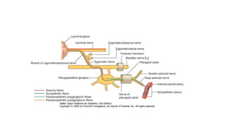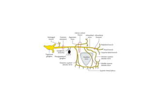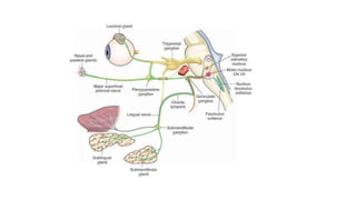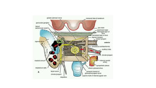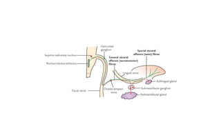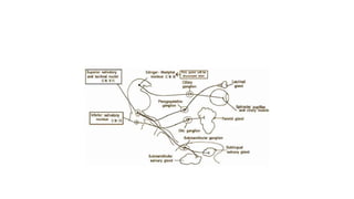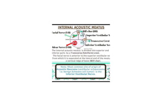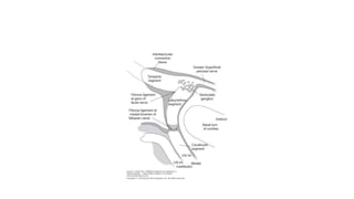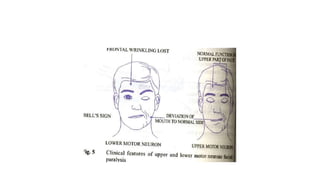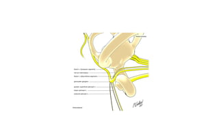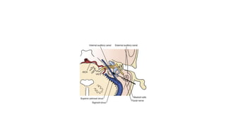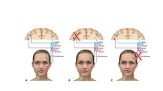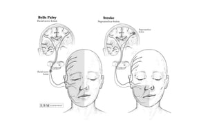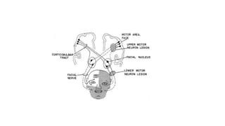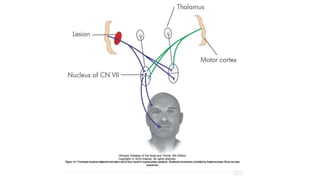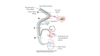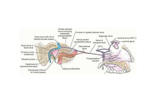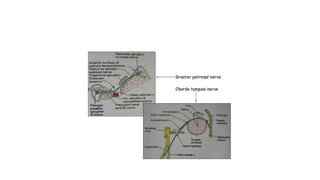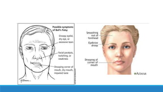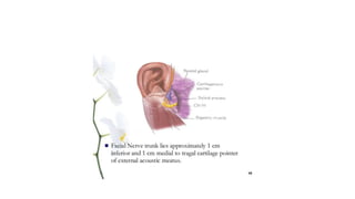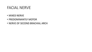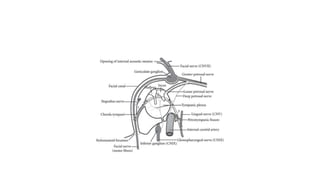 The document provides a comprehensive overview of the facial nerve, detailing its structure, functions, common injuries, and associated conditions such as Bell's palsy and Ramsay Hunt syndrome. It discusses the anatomy of the facial nerve, clinical symptoms of injuries, diagnostic approaches, and treatment options. Key points include the importance of timely intervention and the variance in recovery rates among different conditions affecting the facial nerve.