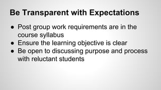 The document provides ten tips for facilitating and managing collaborative learning in online environments, emphasizing clear expectations and relevance to real-life scenarios. It highlights the importance of group formation timing, respect for learner autonomy, and monitoring student interactions to ensure effective collaboration. Additionally, it stresses the need for providing sufficient time and timely feedback to support student engagement and success.