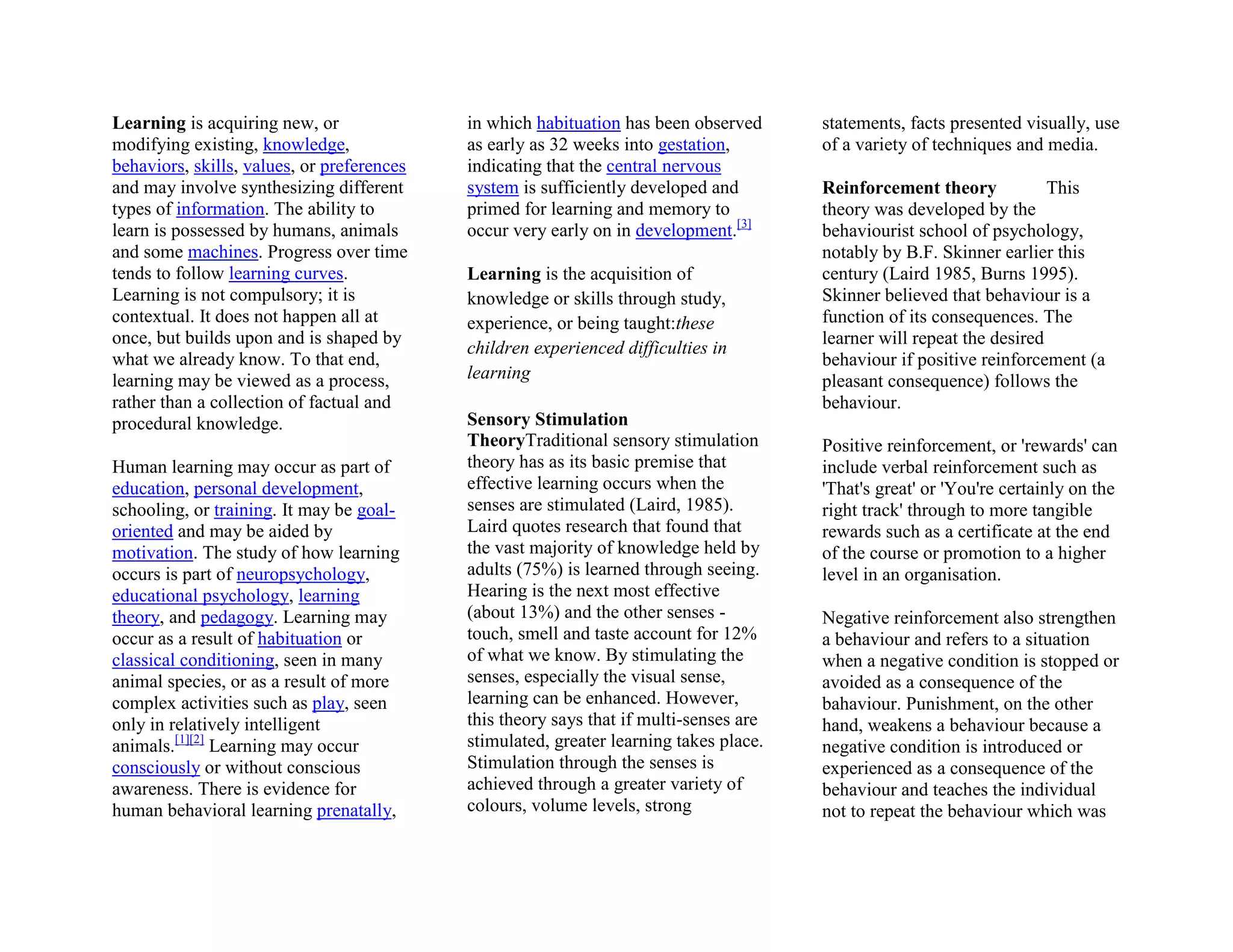 - Learning involves acquiring or modifying knowledge through experience and being taught using various techniques. It is aided by motivation and occurs through processes like habituation, conditioning, play, and complex activities.