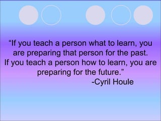 The document discusses the concept of metacognition, which refers to thinking about one's own thinking and learning processes. It defines metacognition as consisting of metacognitive knowledge and regulation. Key aspects of metacognition include monitoring one's progress, evaluating learning strategies, and making adjustments when needed. The document outlines categories of metacognitive knowledge such as knowledge of personal learning variables, task variables, and strategy variables. It also provides examples of teaching strategies that can help develop students' metacognitive abilities.
