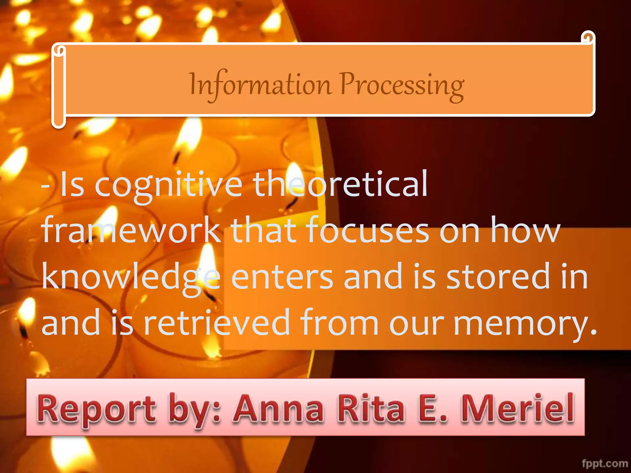 The information processing theory focuses on how knowledge enters and is stored in memory and retrieved. It involves three main stages: encoding, where information is perceived and attended to; storage, where information is kept for brief or extended periods; and retrieval, where stored information is reactivated. There are different types of knowledge like general/specific, declarative, procedural, and episodic. Memory involves three stages - sensory register (holds info <3 sec), short-term memory (holds 5-9 chunks for 18 sec), and long-term memory (unlimited capacity, indefinite duration). Forgetting occurs through decay or interference, while retrieval is increased through rehearsal, meaningful learning, organization, elaboration, imagery, generation, context,