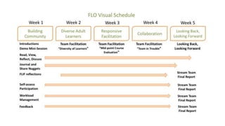 The document describes a session on facilitating online learning at a conference, emphasizing the importance of experiential learning and networking. Participants shared positive feedback about the course, noting its practical applicability and effective instructional methods. The session included various interactive modules and discussions aimed at improving online facilitation skills.
