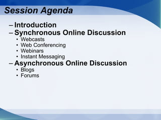 The document outlines methods for facilitating online discussions in e-learning, covering both synchronous and asynchronous formats. It details various technologies such as webcasts, webinars, and forums, along with their characteristics, requirements, and leading products. Best practices and considerations for implementing these technologies in educational contexts are also discussed.