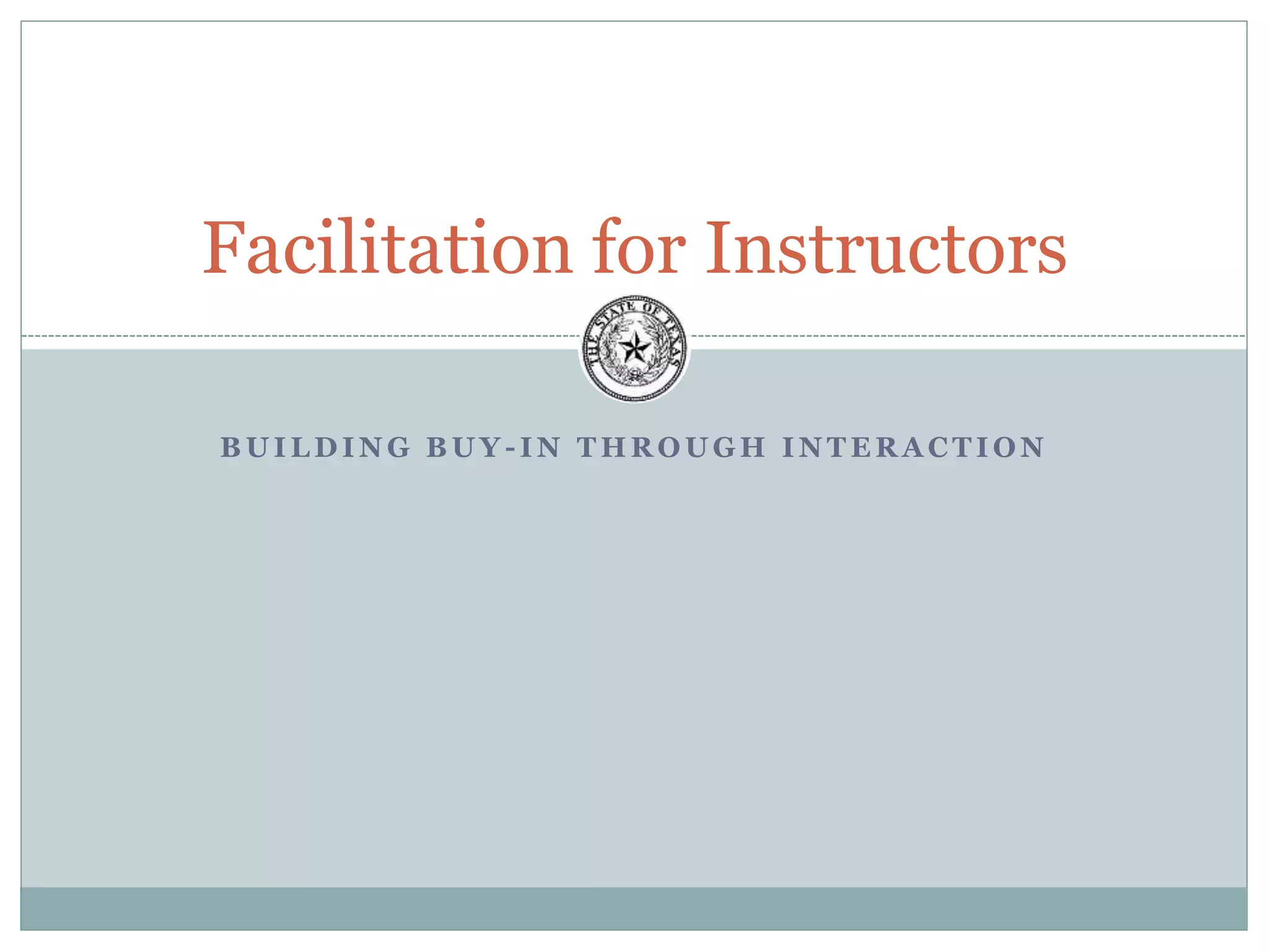 This document provides strategies for instructors to facilitate training sessions using participant-centered methods. It discusses that facilitation involves guiding participants to figure things out themselves rather than simply instructing. Some key strategies include using hooks like quick quizzes or questions to engage participants at the start, introducing oneself to build credibility, setting community expectations, and using icebreakers to help participants get to know each other and feel more comfortable. Facilitation helps build buy-in from participants and keeps them focused through participation and interaction. The document also discusses styles of classroom management and tips for handling different types of difficult participants.