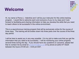 This three day online training program provides facilitator skills training. Penny Valentine will serve as the instructor over the asynchronous course. The training will cover establishing an online presence, communication skills, learning theories, and tools for online teaching. Trainees will participate in discussions, assignments, and a final assessment. The goal is to help new online facilitators develop the skills needed to manage an online classroom and engage distance learners.